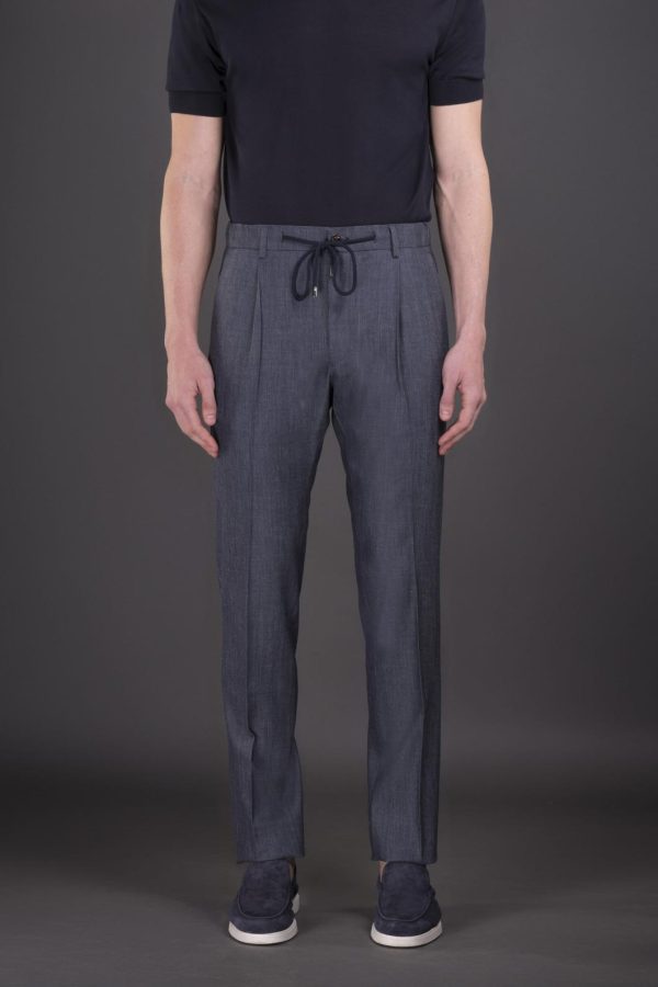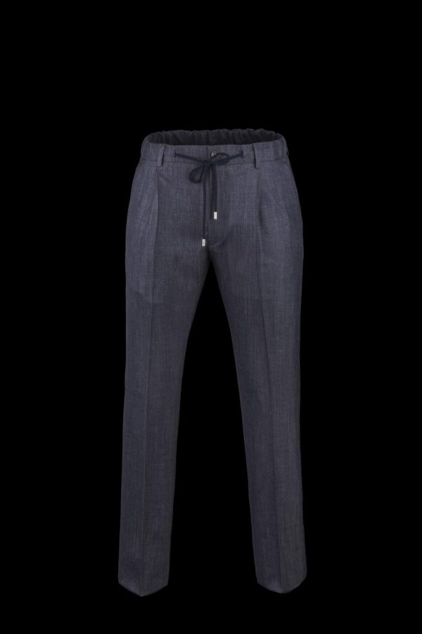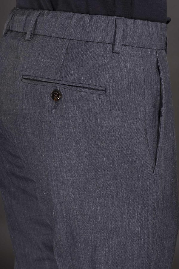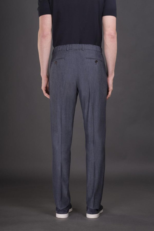 Pants made from a compact fabric composed of very fine wool, silk, and linen, ensuring comfort and extreme freedom of movement. The combination of dyed threads creates a chromatic effect resembling denim.