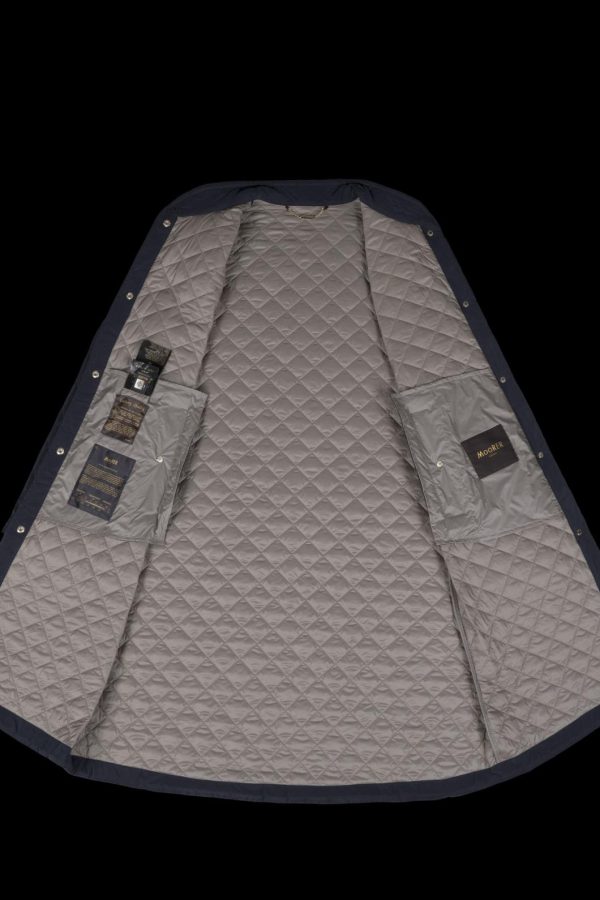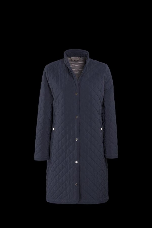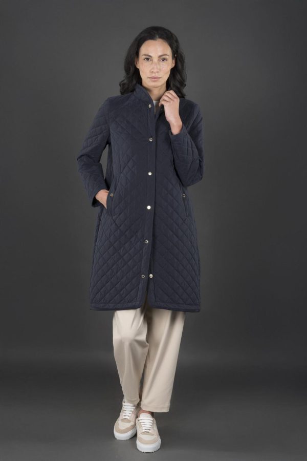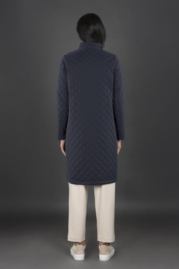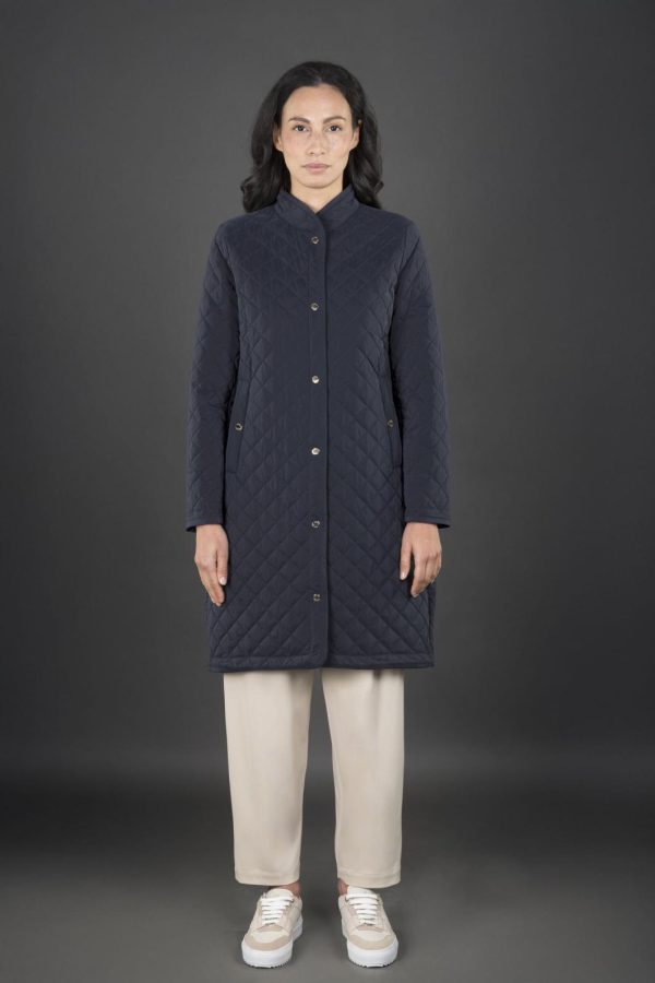 Made of iridescent microfiber technical fabric with silky appearance and refined peach hand, quilted in diamond pattern and padded with soft down-effect wadding.