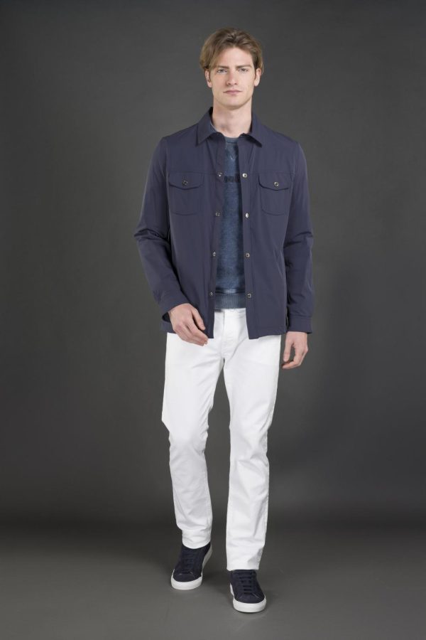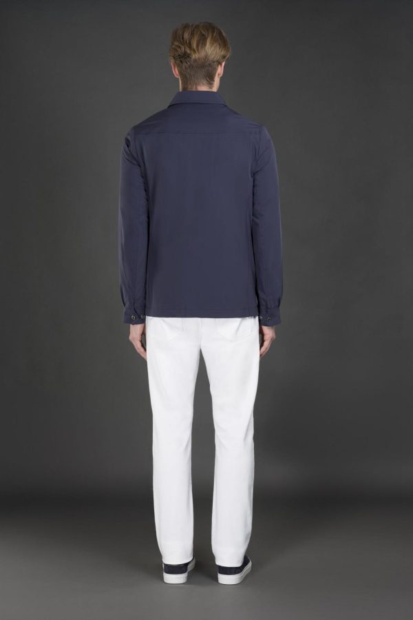 Shirt jacket from the Aqua Line (1 umbrella), made from a water-repellent resin-coated stretch fabric, very compact and resistant to tension. Unlined internally and finished with resin coating on the reverse side.