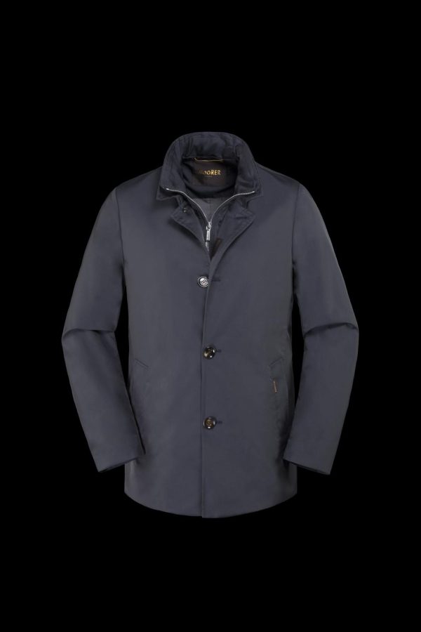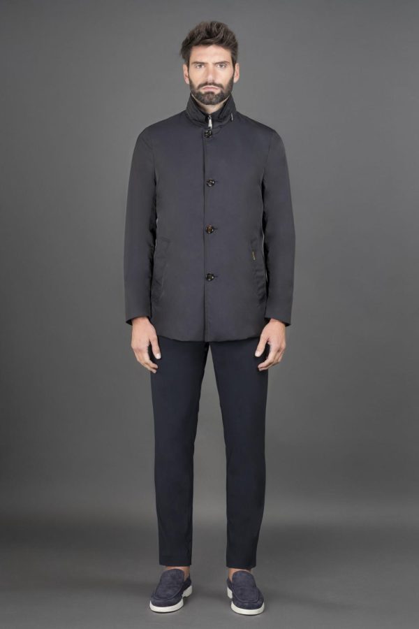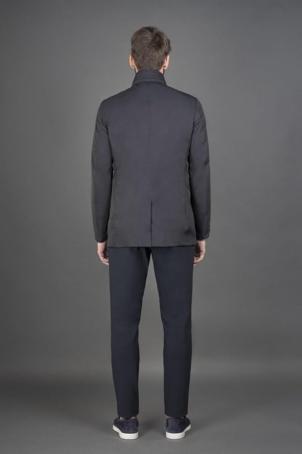 Made of shape memory technical fabric with a light resin coating that gives the garment modest water resistance. The special treatment gives the fabric a subtle sheen, especially accentuated in darker tones.