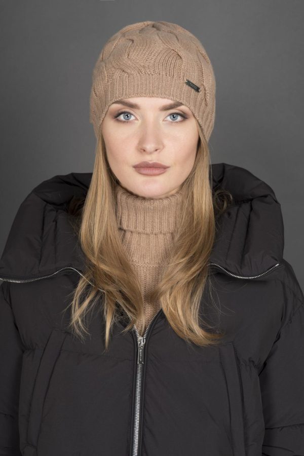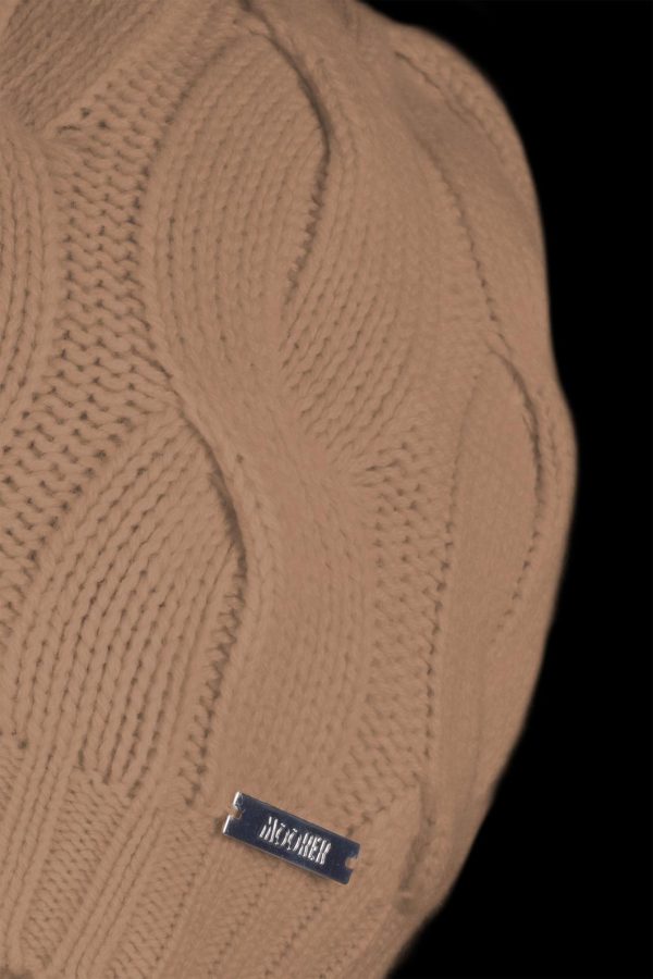 Made of cashmere yarn worked with a regular large braid and a braid with more sinuous and soft lines, alternating with a filler stitch. This technique adds volume to the pattern and makes the fabric soft, light and full-bodied.