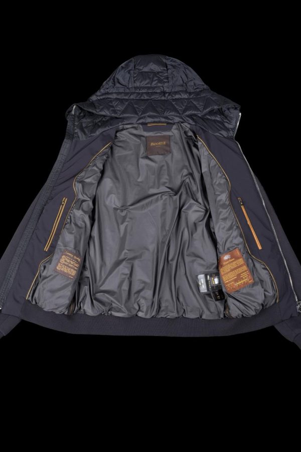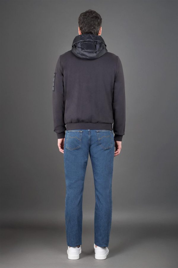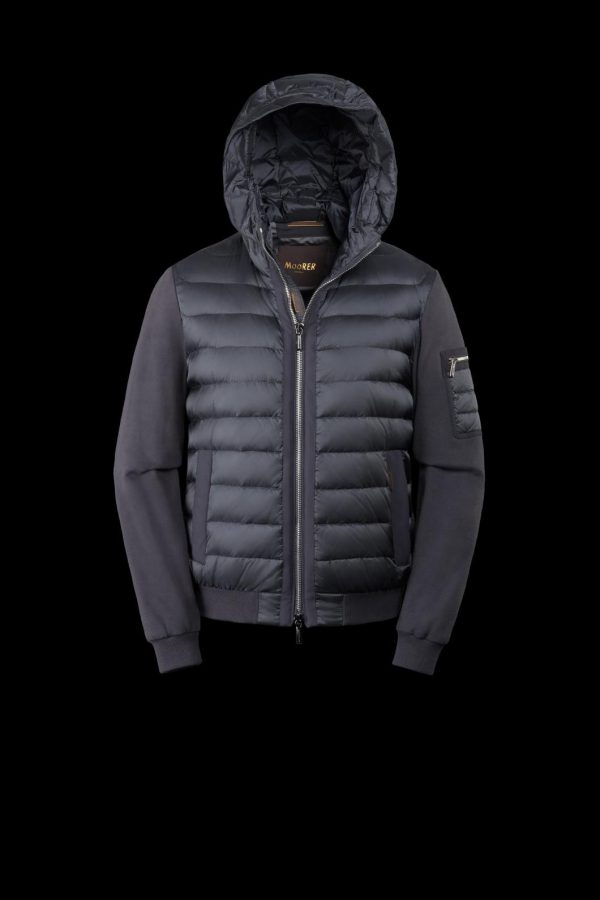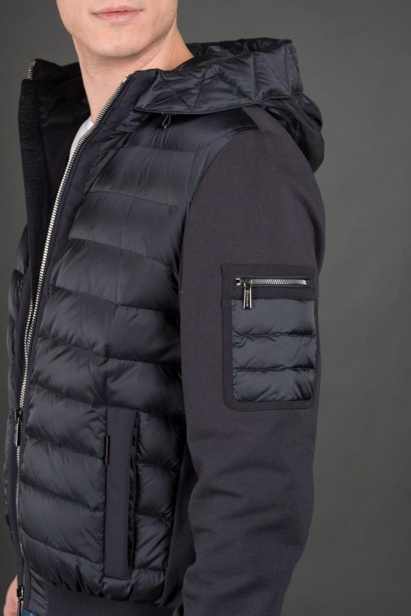 Hybrid bomber jacket. boudin quilted and goose down padded. Made of a technical fabric with water-repellent resin coating with a smooth, shiny and slippery feel, contrastingly combined with a 100% cotton jersey, which gives the garment a soft and warm feel.