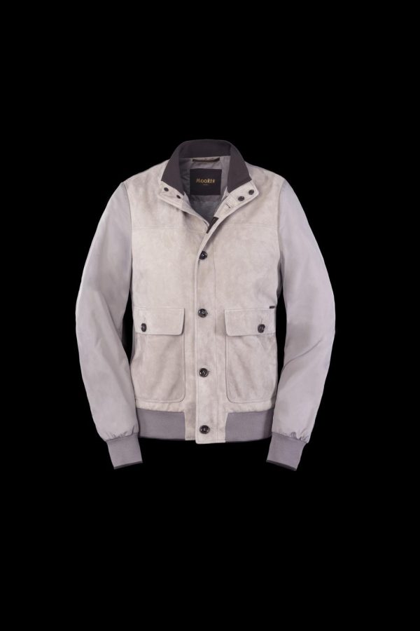 Bomber jacket made from exclusive lambskin suede combined with sections in double dyed iridescent gabardine taffeta.