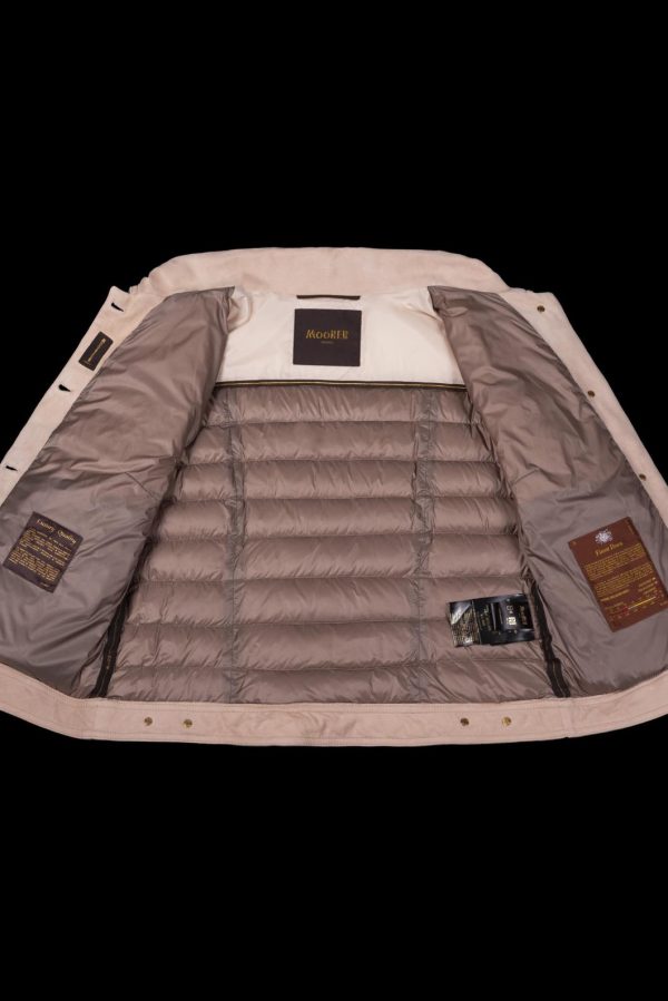 Hybrid casual jacket with double-needle stitching, crafted in a bold mix of materials. Fine suede leather, soft, lightweight, and durable. Paired with precious down-proof technical nylon, quilted in boudin style and padded with the finest goose down, making it warm, lightweight, and suitable even for mid-season wear.