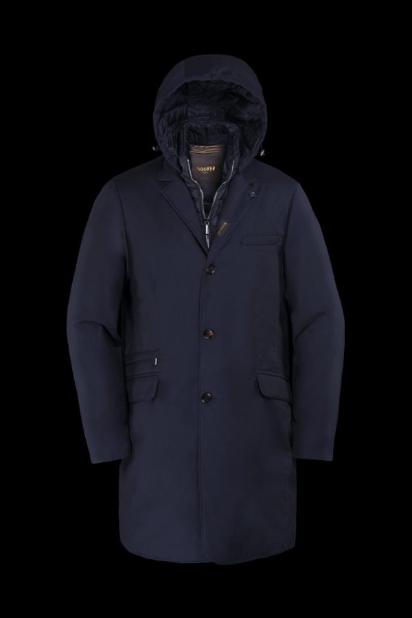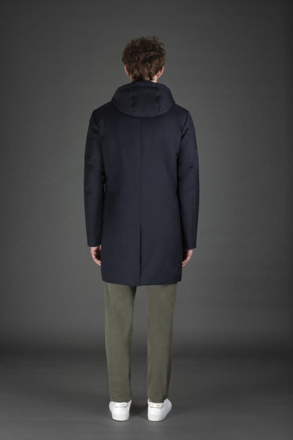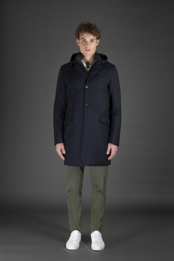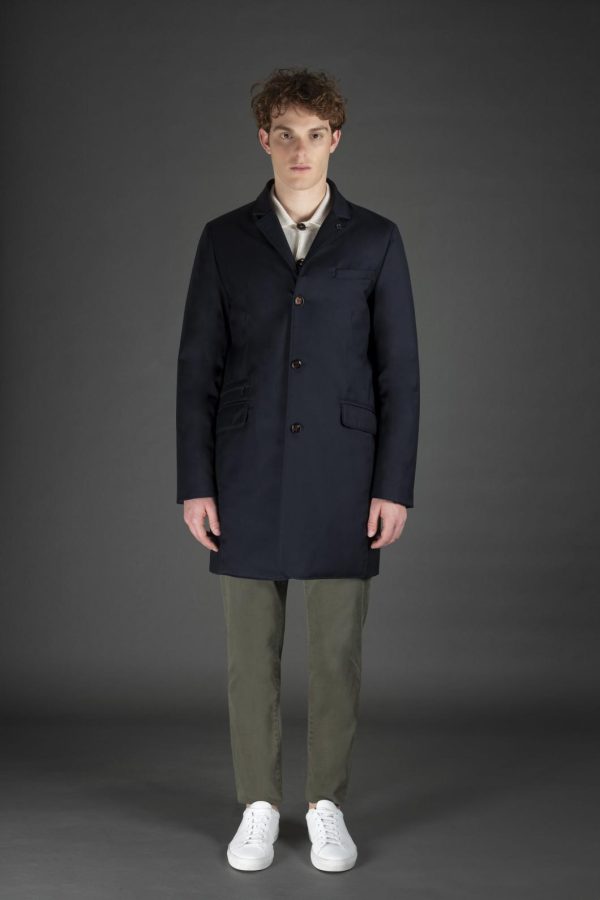 Smooth and functional coat belonging to the Acqua line (2 umbrellas), with a modern and elegant cut, slightly fitted, perfect as a business travel garment.