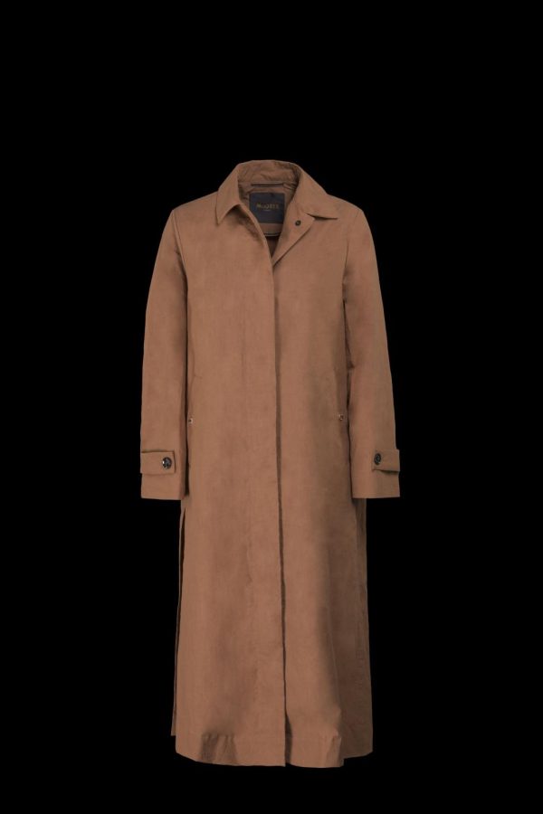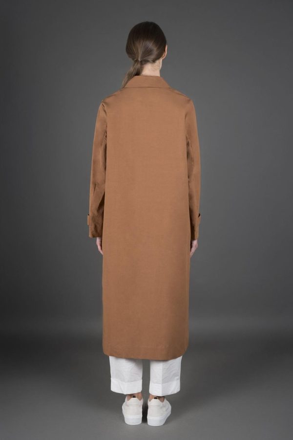 Cleanly tailored single-breasted trench coat made of sturdy cotton-linen blend canvas with a “natural froissé” (slightly creased to create a relaxed, not-too-formal look) appearance. It features a natural and modest water resistance due to the intensity of the weaving beats.