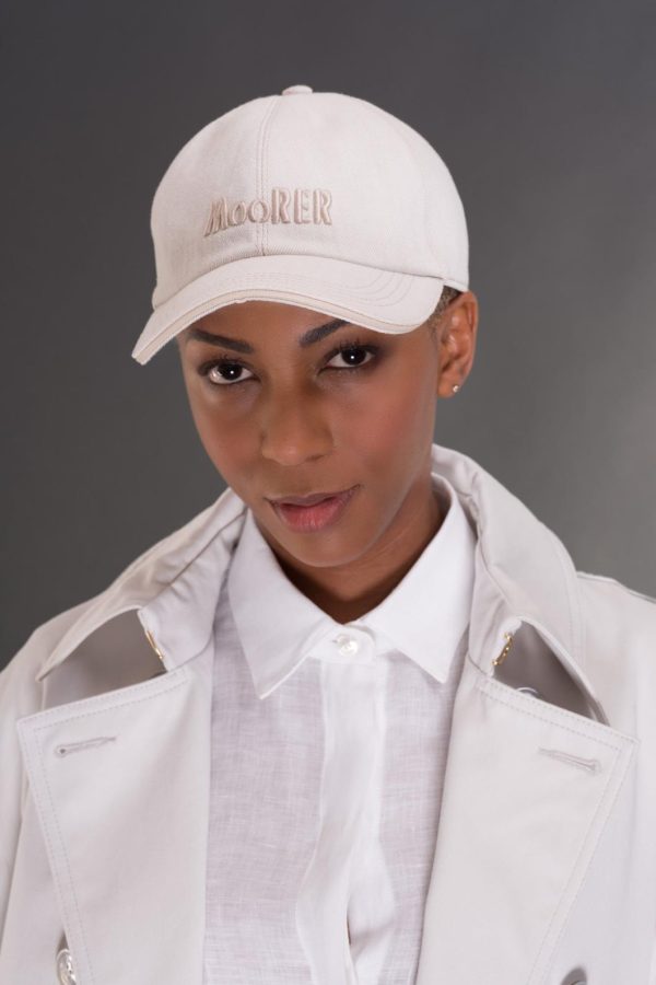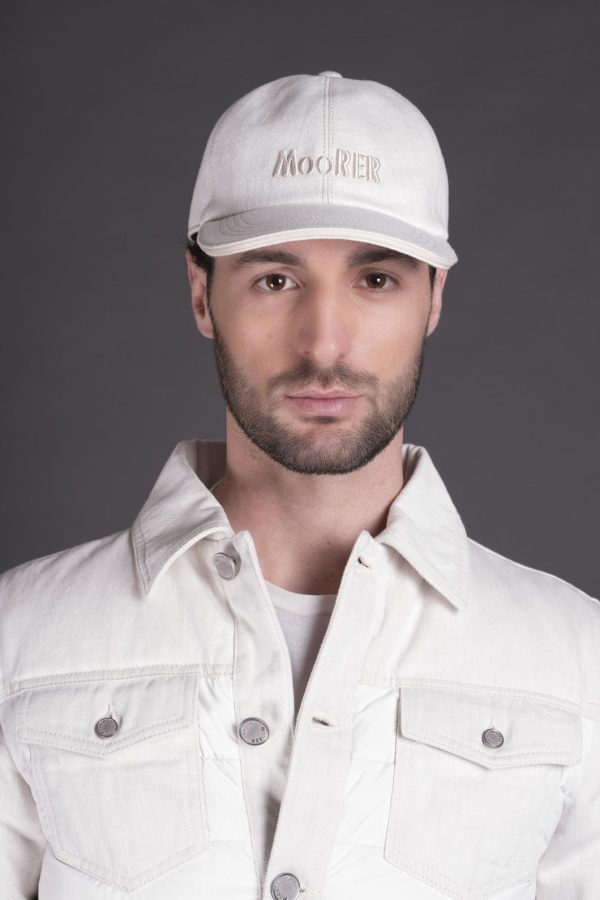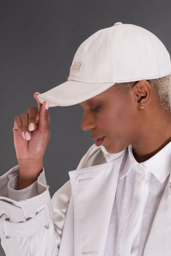 Baseball cap made of exquisite ecru denim woven on ancient Japanese looms, made from pure thread-dyed cotton. The fabric is garment-treated with pumice stone to achieve a distinctive chalky effect with a delicate slub that makes it absolutely unique.