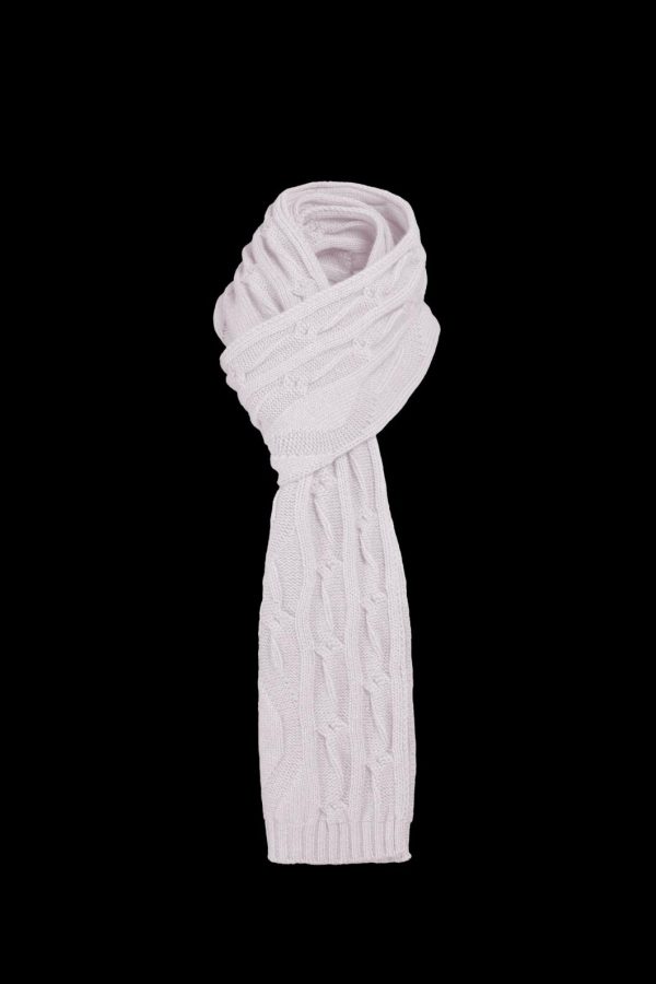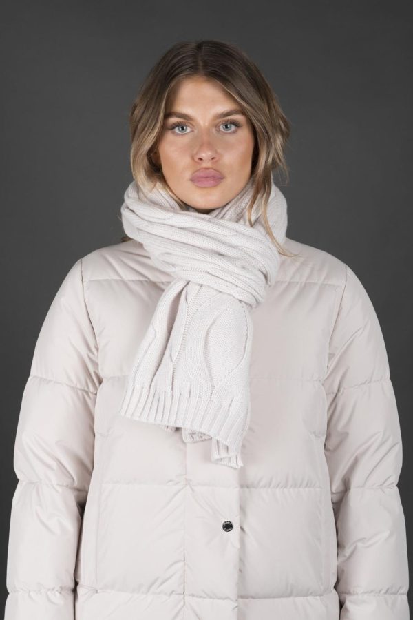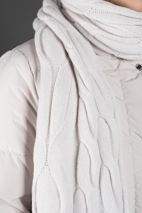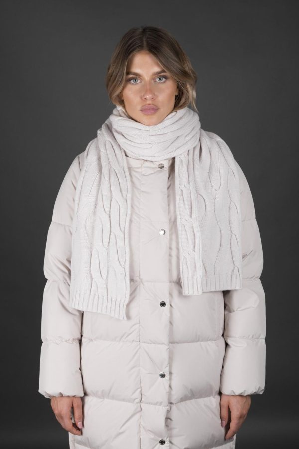 Warm scarf made from cashmere yarn, crafted with a large regular braid and a more sinuously soft braid, alternated with a filling stitch. This technique adds volume to the design and makes the fabric soft, lightweight and substantial.