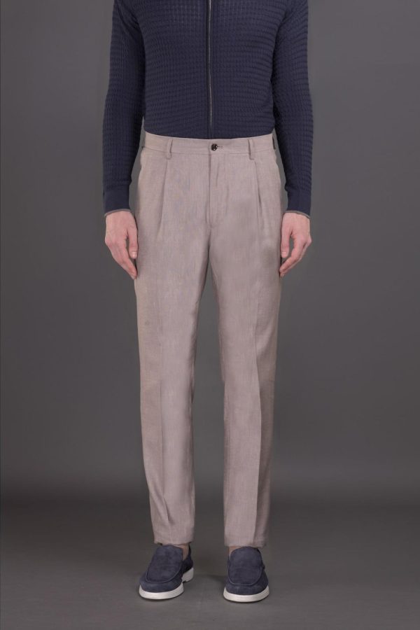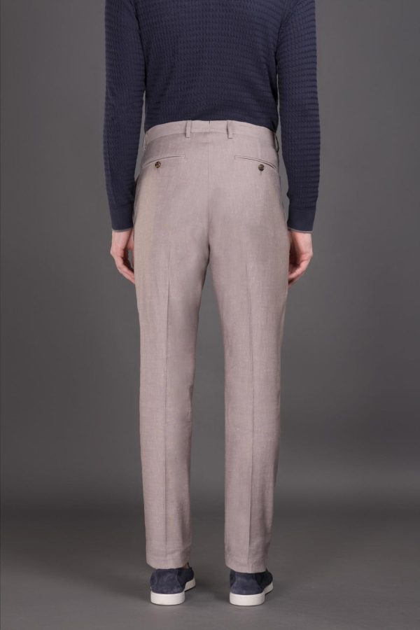 Chino pants crafted from a high-quality blend of linen and cotton. The fabric, woven with dyed threads and white cotton, creates a chromatic effect reminiscent of denim.
